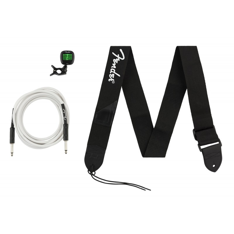 - Productos incluidos: Correa de poliéster de 5 cm con el logotipo Fender blanco, cable de instrumento de PVC blanco de 3 m (recto/recto) y afinador con clip FT-1