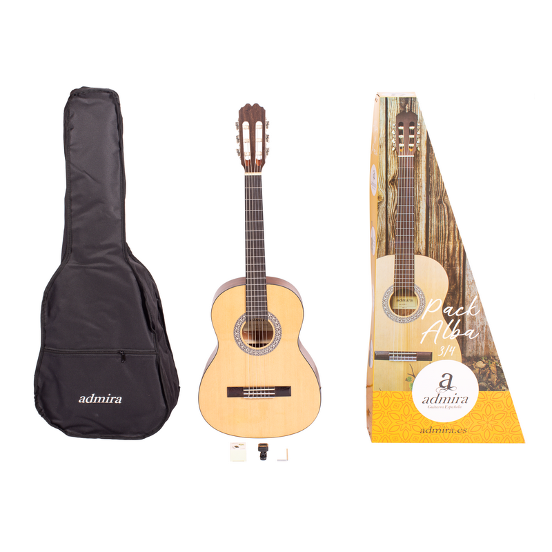 Pack guitarra ADMIRA ALBA 3/4. Incluye: Guitarra clásica Alba 3/4. Funda de nylon. Afinador digital de pinza.