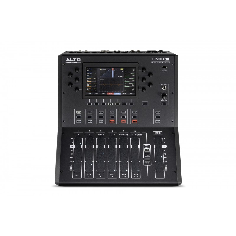 El Alto TMD-16 es una mesa de mezclas digital de 16 canales diseñada para ofrecer control avanzado, procesamiento interno y mezcla remota en directo o estudio. Combina un motor DSP completo con control mediante pantalla táctil, tablet o smartphone, permitiendo gestionar entradas, efectos y mezclas desde cualquier punto del escenario. Su enfoque compacto y su conectividad moderna la hacen ideal para bandas, técnicos de sonido, salas pequeñas, iglesias y aplicaciones móviles donde se requiere potencia digital sin un formato voluminoso.